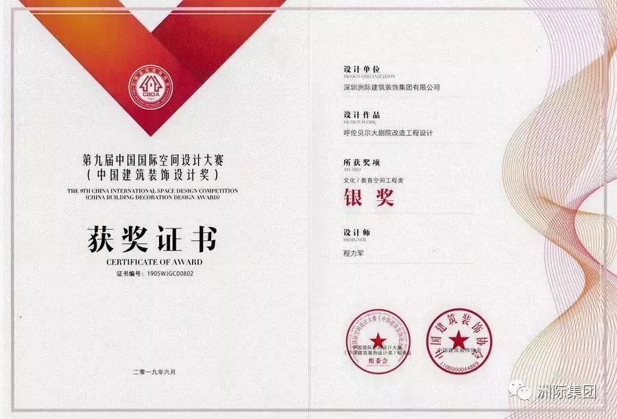 深圳洲際建筑裝飾集團有限公司(以下稱洲際裝飾集團)選送的多項優秀設計作品憑借出色且富有創意的設計在此次行業賽事的激烈角逐中脫穎而出,斬獲多個重量級設計類獎項:深圳龍崗古陶瓷博物館裝飾裝修設計榮獲“中國建筑裝飾設計獎藝術陳設?展陳空間方案類金獎”;呼倫貝爾大劇院改造工程設計榮獲“中國建筑裝飾設計獎文化?教育空間工程類銀獎”;同時,在機構類獎項的評比當中,洲際裝飾集團被評為“2018年度中國建筑裝飾杰出公共空間設計機構”。