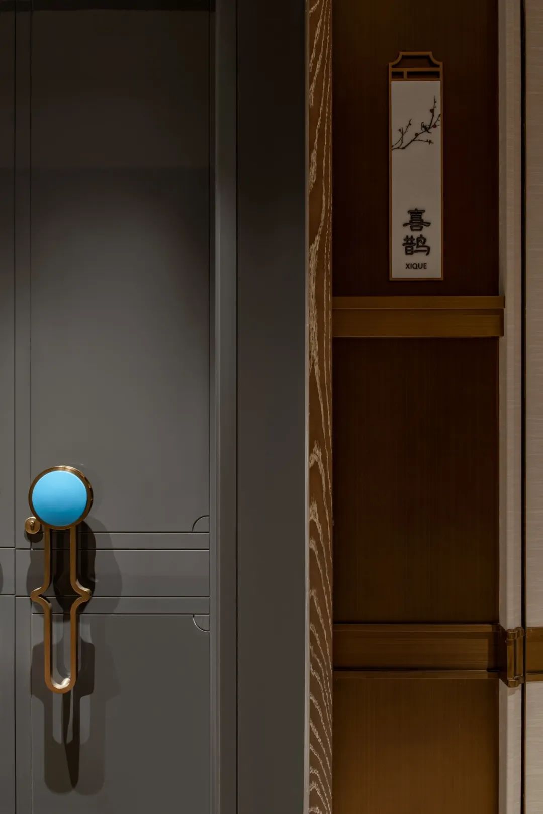 裸露的深棕原木紋理,由墻鋪展桌椅、邊柜、花窗,精心設計的燈光或隱或現,令人倍感溫潤與親密。高瓷藍點綴流線雕塑、黃銅把手及布藝沙發;松石綠暈染如玉燈光壁、星砂裝飾畫……幽暗氛圍中,雙色交相輝映,如千里江山圖里的只此青綠,韻味無窮。