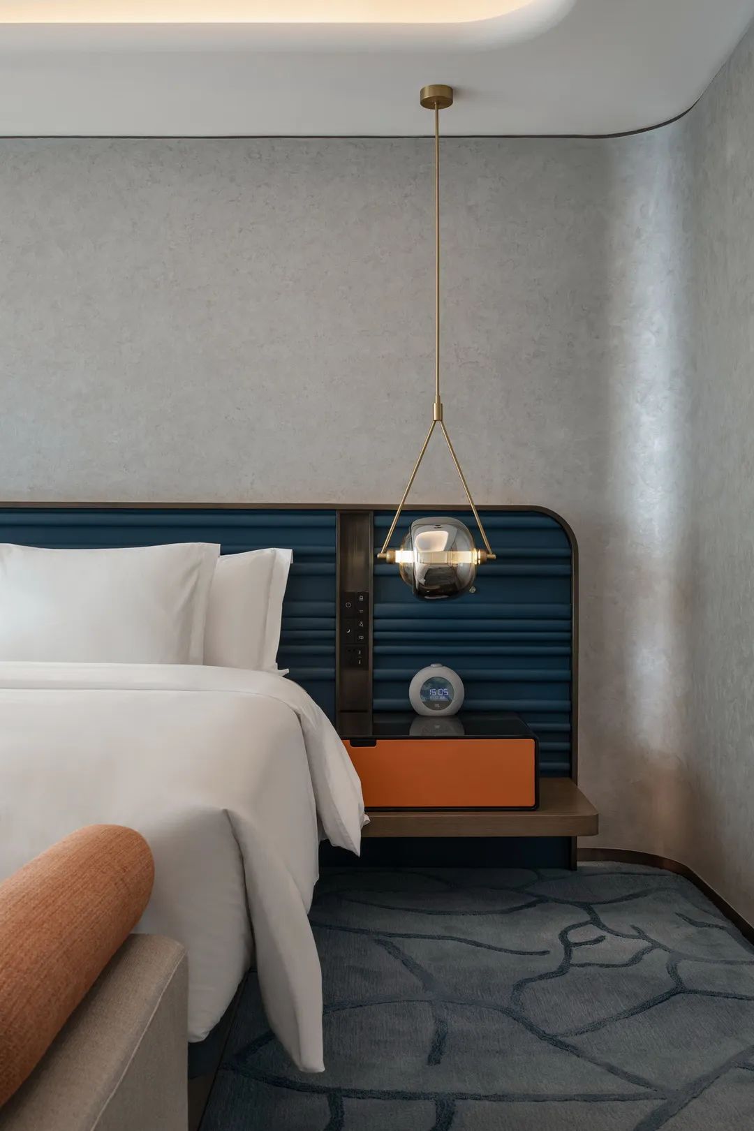 流動的弧線并未間斷,延伸至電梯廳,探入層層客房。素白或暗銀墻面圍合,精心搭配煙灰色地毯及造型簡潔的家具,偶有一點亮橙色,營造出沉靜穩定的氛圍。