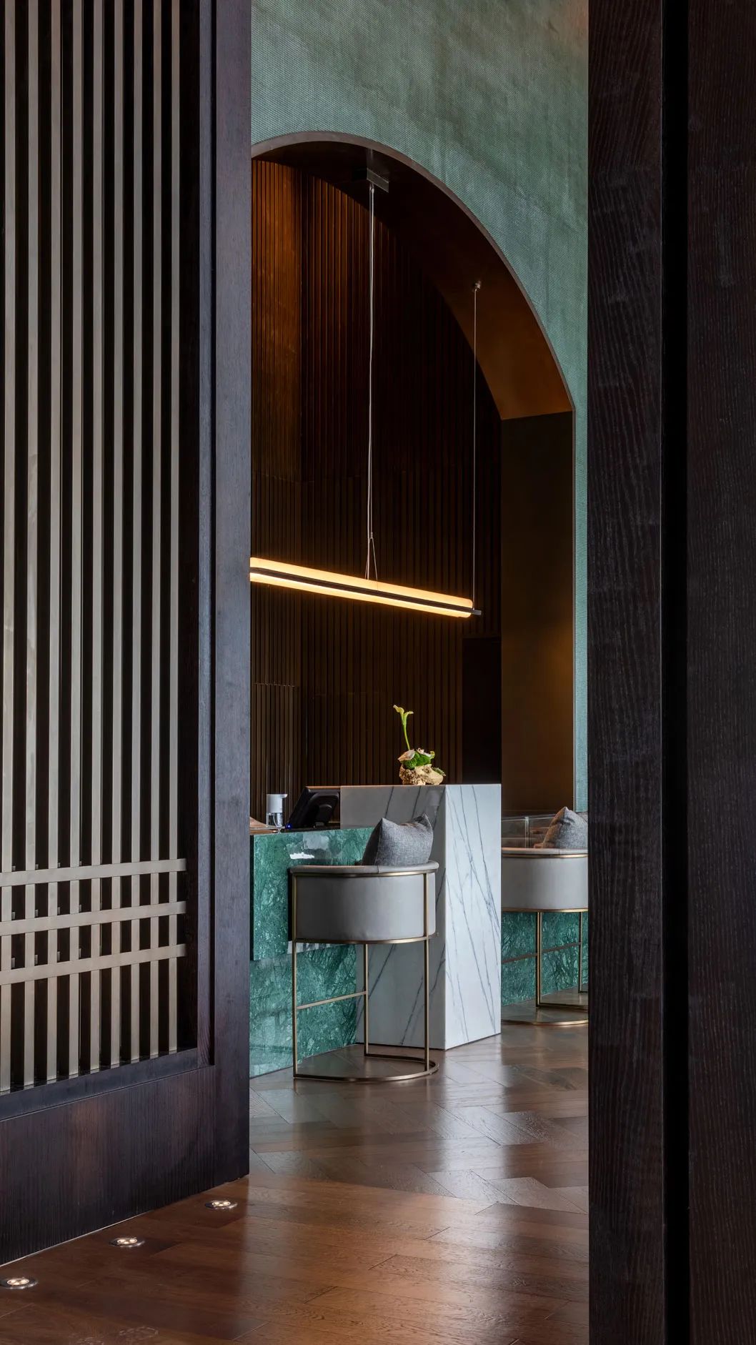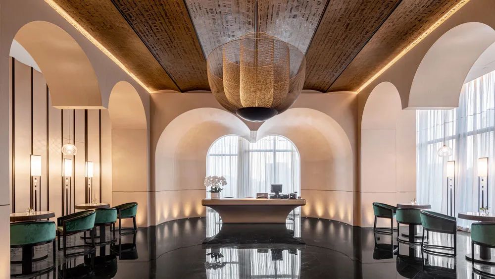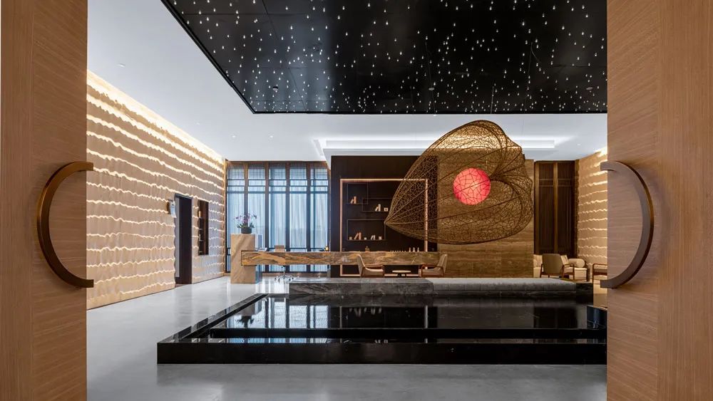 酒店采用獨特的雙大堂設計,首層大堂以“胡同”為主題,連接著世外桃源和別有洞天的謐境,穿過高高的木扇門,9m的高空星羅棋布的星光繪制成蓉城的地圖,天地交融韻味獨特,貼心的地暖設計讓溫度和濕度都仿佛置身桃花園中溫暖的家。