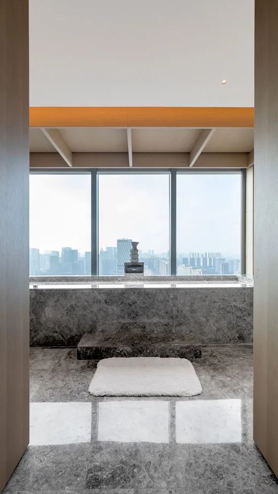 位于18層的養生中心以“庭院下溫暖的夜光”為靈感,在600㎡的空間中將山之自然,水之靜謐化作空間意境,300㎡的云端無邊際恒溫泳池讓賓客仿佛置身于“雨下的庭院”。
