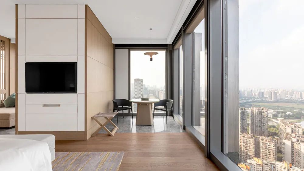 64間行政客房、套房中都配備了3.5-4m不等的寬綽江景私湯泡池和雷允上300年歷史傳承的中草藥湯包,讓賓客在盡覽江天一色的天府美景間,身心酣暢,盡享舒適快意。