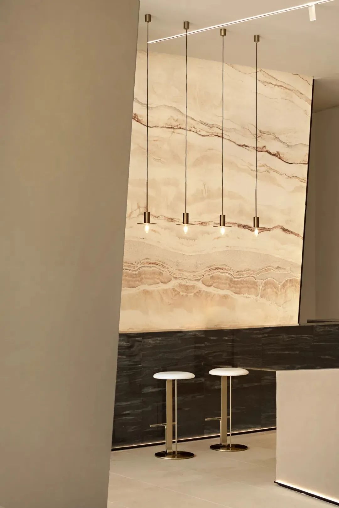 以山石的自然肌理,以現代的手法重新呈現和組合,光滑和粗糙材質的對比和高高低低的組合形式,把自然的氣息引入空間。