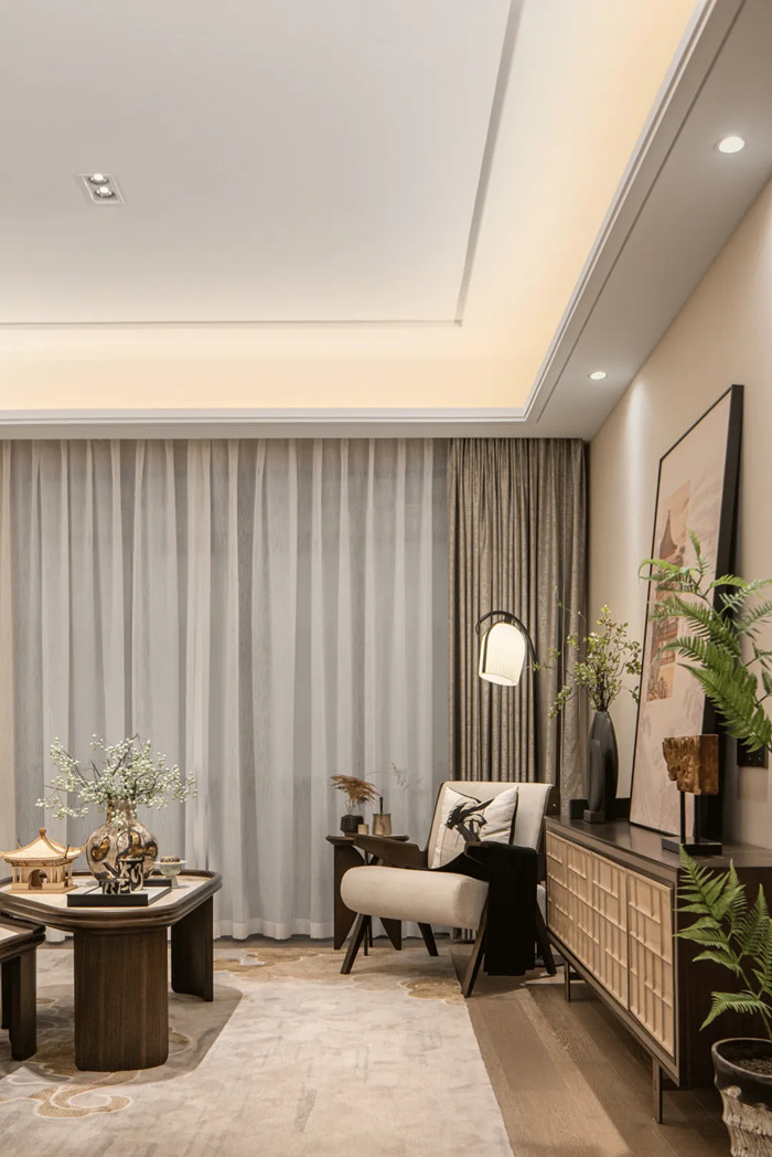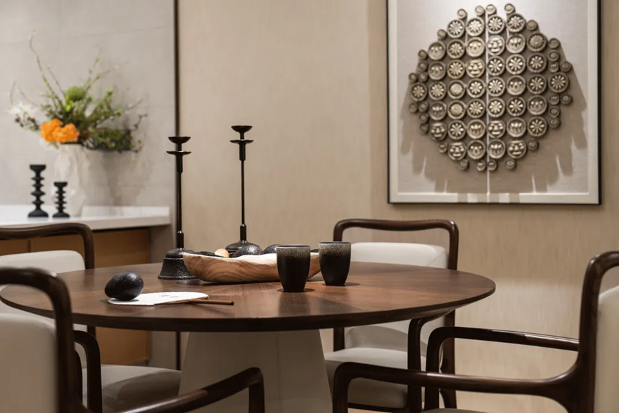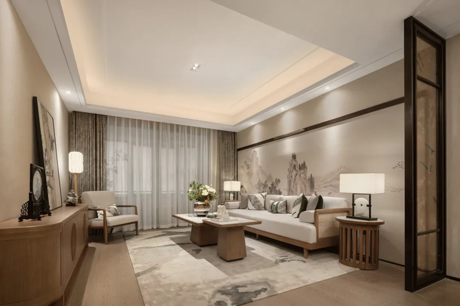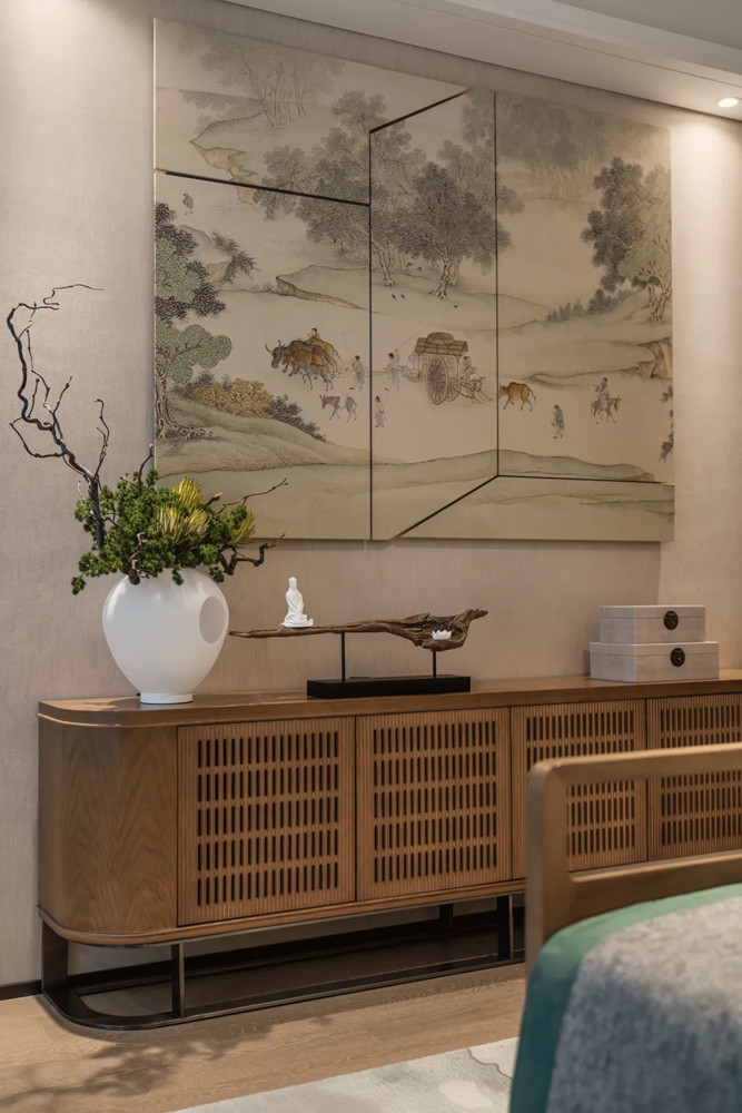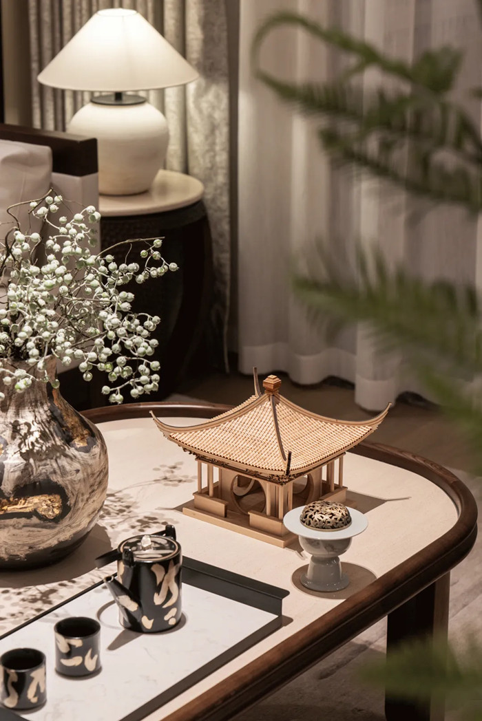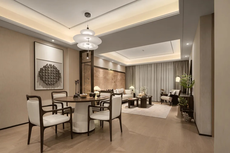 一體式的設計令空間顯得大氣而舒展,客廳是家的社交地點,也是景之所在。空間以南京意境為主題,追敘過往時光。