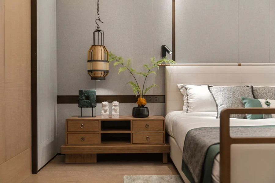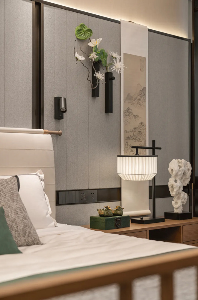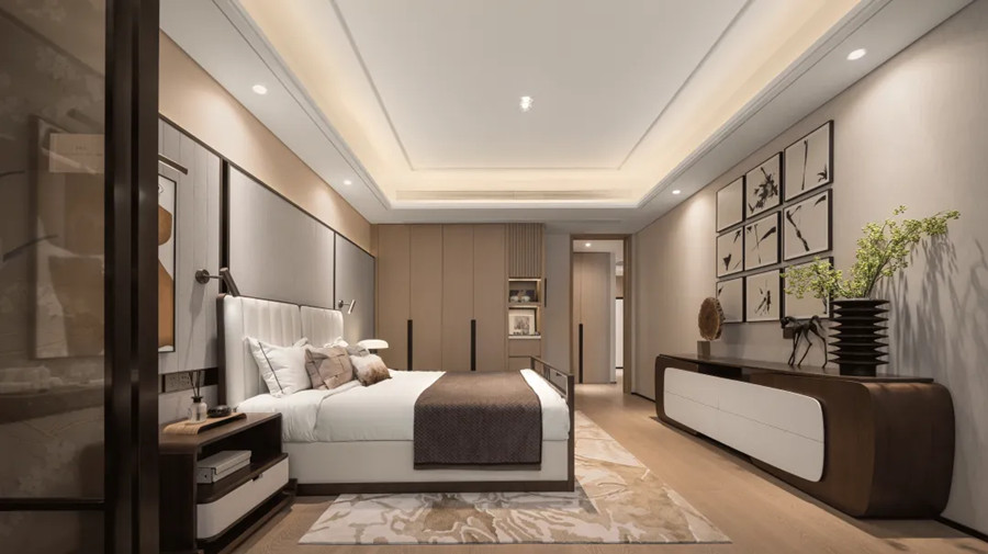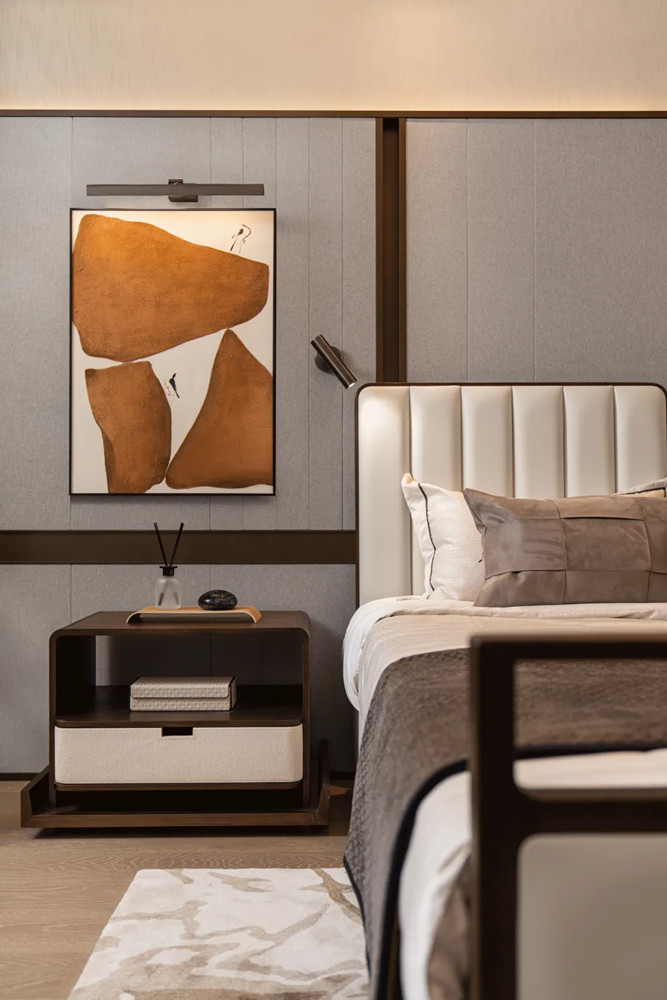 老人的睡眠空間傳承了從建筑中來的中式留白意境,雅致沉穩的棕調構建出具有東方氣質的禪意之所,適度留白傳遞長者淡雅從容的生活品味,在飽滿的間距式照明光影的交織中,勾畫出一間具有多重維度體驗的就寢空間。