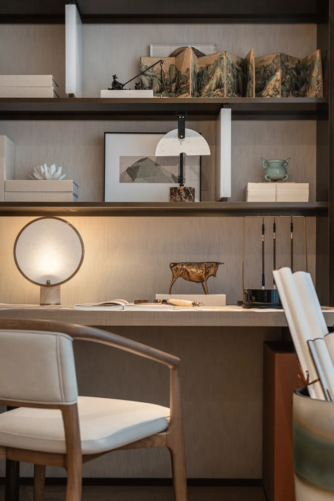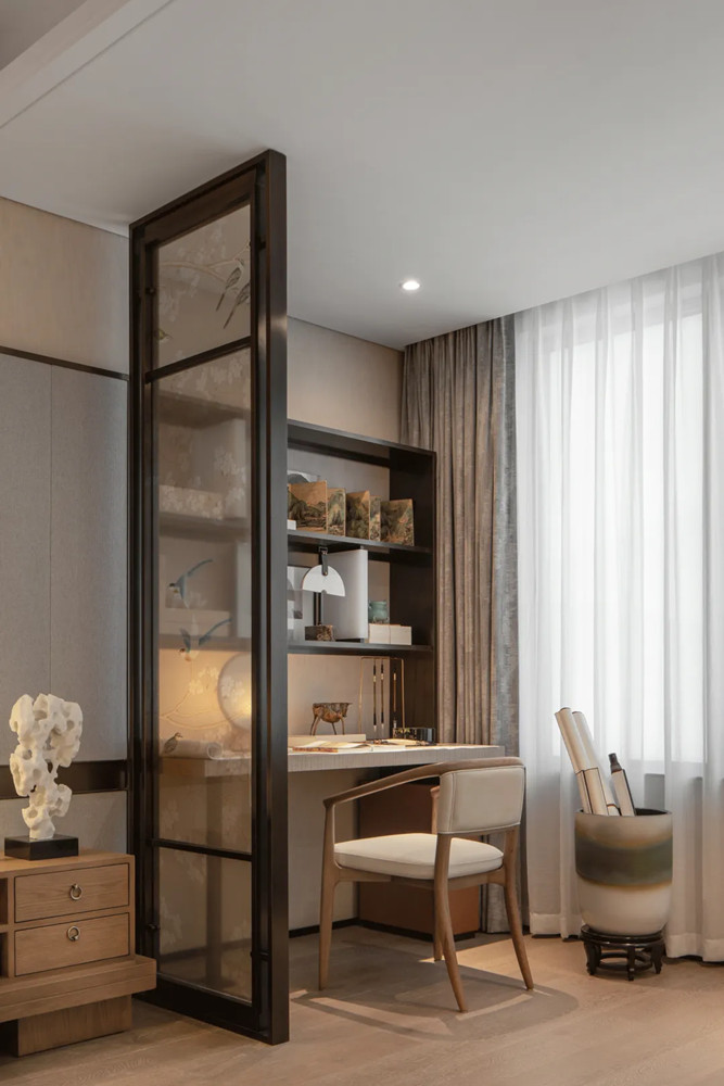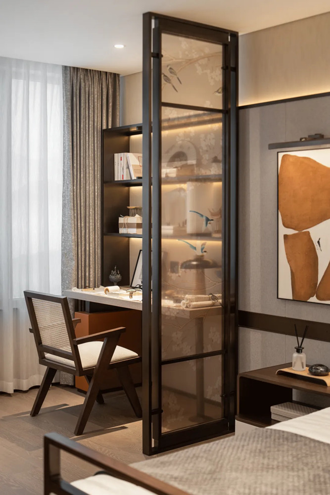 書桌用朦朧屏風隔開,營造一種隔而不斷的別質感,增添空間層次與意境,墻面擺件是長者晚年興趣愛好的呈現,局部點綴靚麗橙色,既為空間注入活力,又保障了老人視覺的舒適度。