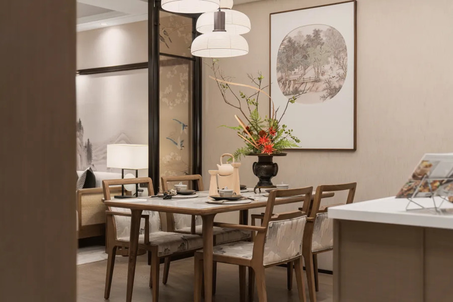 餐廳呈現出一種東方韻味,隔而不斷的花鳥屏風、中式風格的餐桌椅、自然雅趣的桌面擺件、充滿懷舊感與藝術性的裝飾掛畫,無一不在詮釋積極美好的老年生活。廚房設計超出市面傳統養老配置,以長時間居家使用為目的,打造更加便利有溫度的用餐場地。