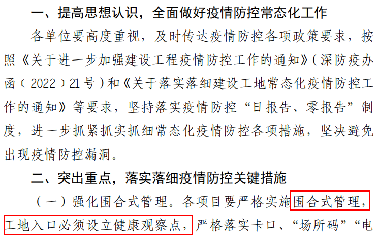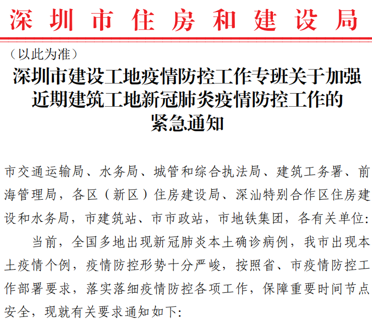 近日,深圳市建設工地疫情防控工作專班發布了關于加強近期建筑工地新冠肺炎疫情防控工作的緊急通知。