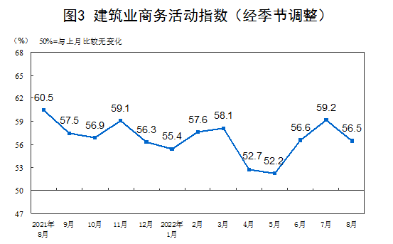 近日,國(guó)家統(tǒng)計(jì)局發(fā)布2022年8月中國(guó)采購(gòu)經(jīng)理指數(shù)情況。國(guó)家統(tǒng)計(jì)局服務(wù)業(yè)調(diào)查中心高級(jí)統(tǒng)計(jì)師趙慶河表示,8月份,非制造業(yè)商務(wù)活動(dòng)指數(shù)為52.6%,比上月下降1.2個(gè)百分點(diǎn),仍高于臨界點(diǎn),非制造業(yè)連續(xù)三個(gè)月保持恢復(fù)性擴(kuò)張。建筑業(yè)保持較快擴(kuò)張。建筑業(yè)商務(wù)活動(dòng)指數(shù)為56.5%,低于上月2.7個(gè)百分點(diǎn),仍位于較高景氣區(qū)間,建筑業(yè)生產(chǎn)活動(dòng)繼續(xù)擴(kuò)張。從行業(yè)情況看,土木工程建筑業(yè)商務(wù)活動(dòng)指數(shù)為57.1%,新訂單指數(shù)和業(yè)務(wù)活動(dòng)預(yù)期指數(shù)分別升至55.5%和64.1%,表明基礎(chǔ)設(shè)施項(xiàng)目建設(shè)保持較快施工進(jìn)程,市場(chǎng)需求繼續(xù)回升,企業(yè)對(duì)近期發(fā)展預(yù)期向好。