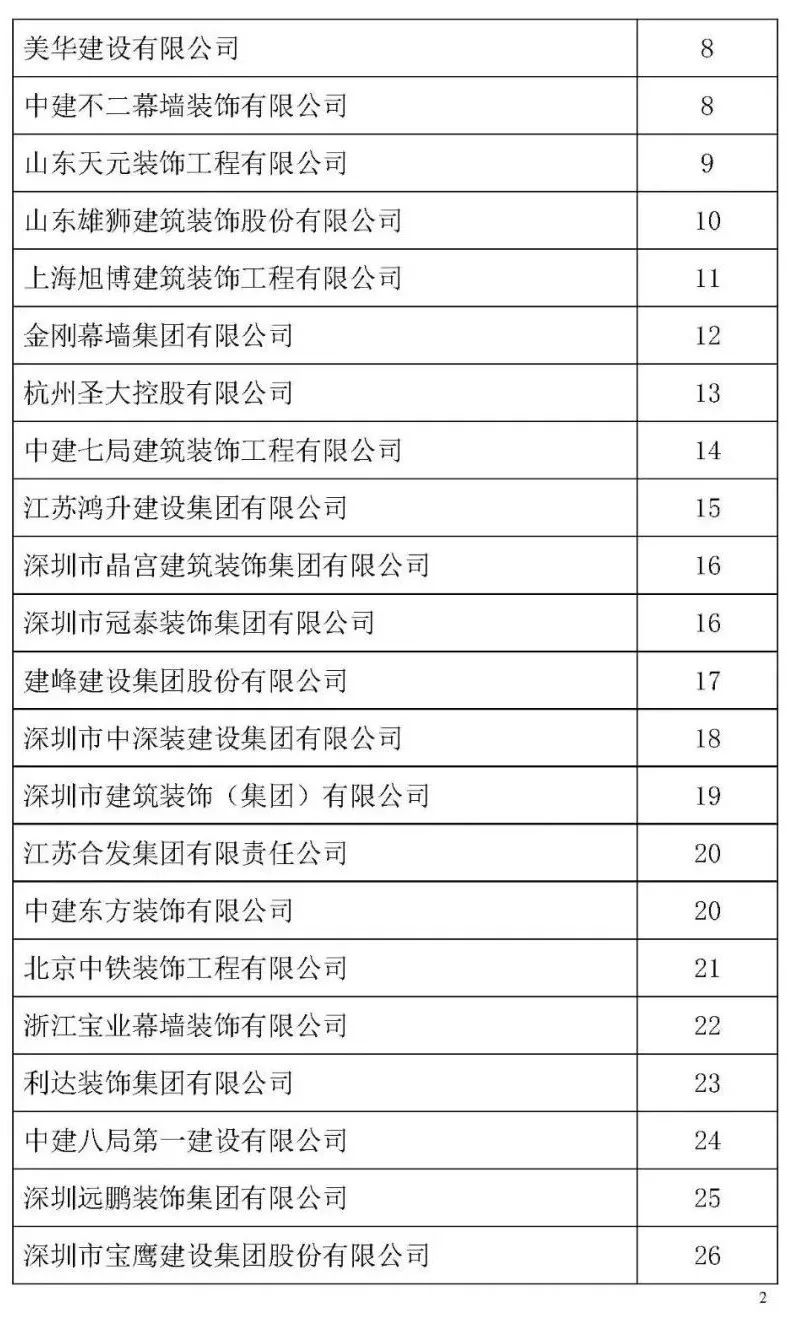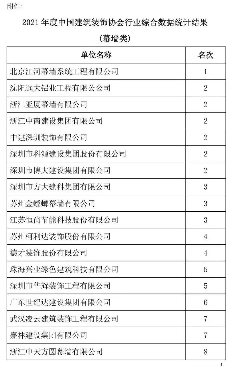 根據中裝協《關于開展2021年度中國建筑裝飾協會行業(yè)綜合數據統計工作的通知》(中裝協 [2022]24號文件)及文件中所確定的工作原則和統計規(guī)則, 中國建筑裝飾協會組織開展了2021年度中國建筑裝飾行業(yè)綜合數據統計工作,此次綜合數據統計工作分為裝飾、幕墻、設計、建材四類,現將2021年度中國建筑裝飾協會行業(yè)綜合數據統計幕墻類結果名單予以公示,公示期7天。