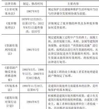 建筑垃圾相關(guān)法律齊全。日本是建筑垃圾立法最為完備的國(guó)家,在日本的專門立法中,政府、企業(yè)、可再生資源利用企業(yè)各方的責(zé)任都規(guī)定得十分清楚,且處理不同種類副產(chǎn)物也有不同的法律。主要有《廢物處理法》、《建設(shè)再循環(huán)法》、《建設(shè)副產(chǎn)物妥善處理推進(jìn)綱要》,此外,還有各縣、市自己制定的法規(guī)。